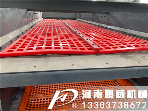 弛張篩是我廠生產的一種新型篩分機械。該機采用雙質體亞共振原理,通過傾斜篩箱上安裝的彈性篩面的弛、張運動拋擲物料的篩分機。其主要特點是篩分效率提高,處理量大,動負荷小,功耗少,噪聲低,因此應用較為廣泛。在這個過程中,彈性聚氨酯篩面以每分鐘800次的頻率連續不斷地擴張、收縮,從而獲得很高的加速度(50g),可處理6mm以下的粘性難篩分的物料,采用獨特的雙重振動原理,即通過共振幫助,使一個基本橢圓振動帶動了其他的一層或多層的浮床曲張,并且浮床曲張振動的振幅遠大于傳統的振動設備的振幅,有效地防止了篩孔堵塞。弛張篩是雙質量振動系統,采用聚氨酚橡膠篩面,支承篩面的任意兩根相鄰橫梁都分別屬于兩個振動質體,其中一個質體是篩箱,另一個質體是配重。在工作時,篩網交替地拉緊和松弛,使物料產生前進彈跳運動,可避免物料黏附篩網并堵塞篩孔。當兩質體相差二相位振動時,任意兩根相鄰橫梁時而靠近,時而遠離,彈性篩面也相應時而松弛,時而張緊,即篩面隨篩箱作牽連運動的同時,還相對篩箱作相對運動。這種弛張運動不僅使篩孔不斷產生變形,而且大大增加了篩面的振動強度,從而有效地克服了篩孔堵塞現象,顯著提高了篩機處理能力。但是因篩箱的振動強度并不大,故機械強度容易保證,但篩面的振動強度較大且反復變形,故篩面壽命較低。根據料群運動自身規律性,鵬威弛張篩可有效的使濕粘物料層松散、分層和透篩。